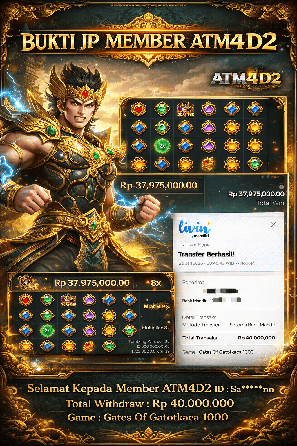 ATM4D2 dikenal sebagai situs terpercaya yang selalu menghadirkan pengalaman bermain slot online yang aman, fair, dan berlisensi resmi. Di sini, kami tidak hanya sekadar memberikan janji, tapi bukti nyata berupa slip kemenangan yang dapat Anda lihat secara langsung.