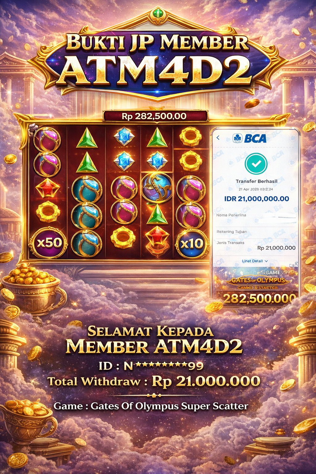 ATM4D2 dikenal sebagai situs terpercaya yang selalu menghadirkan pengalaman bermain slot online yang aman, fair, dan berlisensi resmi. Di sini, kami tidak hanya sekadar memberikan janji, tapi bukti nyata berupa slip kemenangan yang dapat Anda lihat secara langsung.