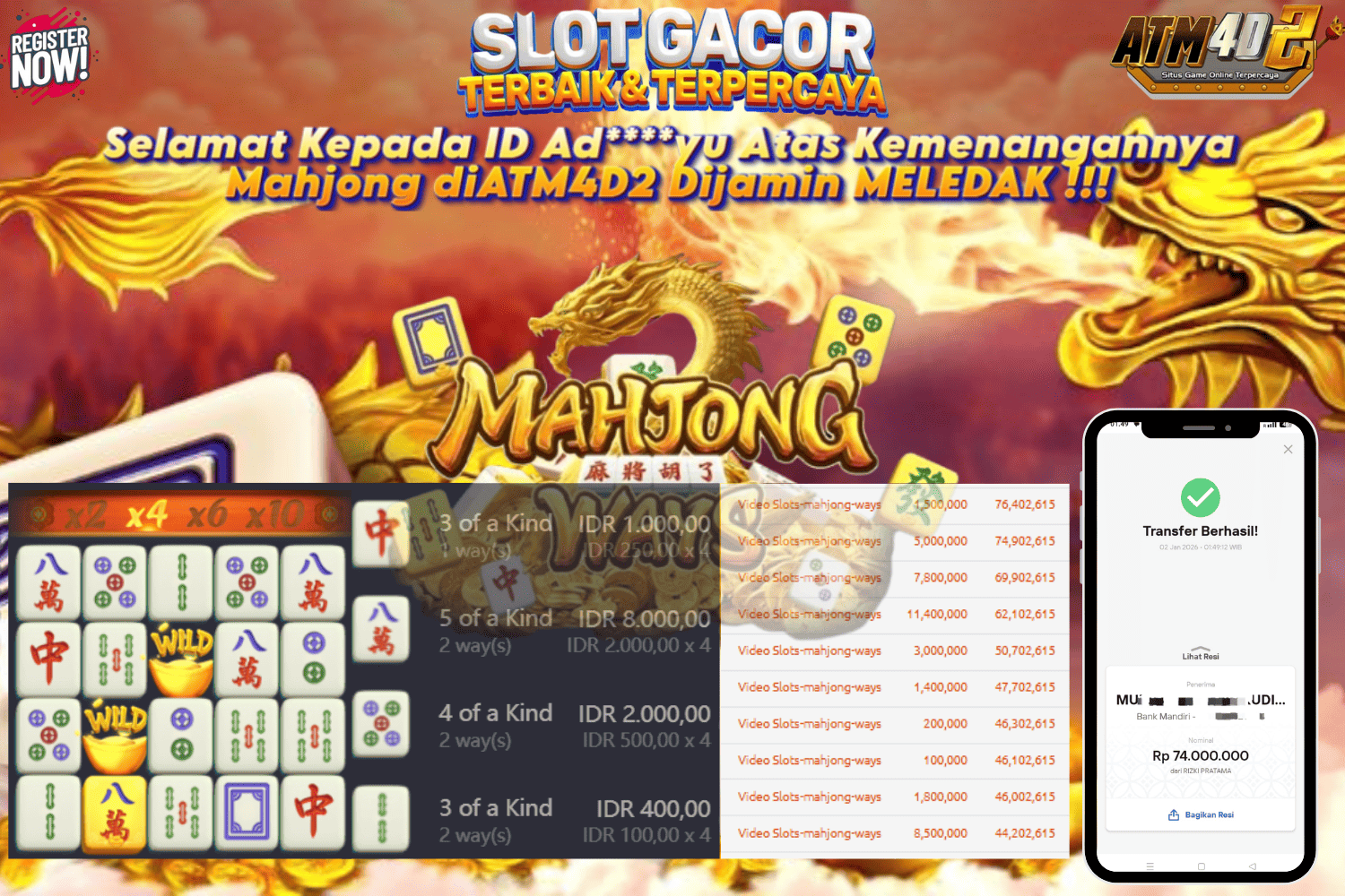ATM4D2 dikenal sebagai situs terpercaya yang selalu menghadirkan pengalaman bermain slot online yang aman, fair, dan berlisensi resmi. Di sini, kami tidak hanya sekadar memberikan janji, tapi bukti nyata berupa slip kemenangan yang dapat Anda lihat secara langsung.