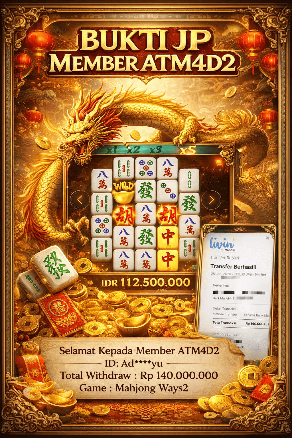 ATM4D2 dikenal sebagai situs terpercaya yang selalu menghadirkan pengalaman bermain slot online yang aman, fair, dan berlisensi resmi. Di sini, kami tidak hanya sekadar memberikan janji, tapi bukti nyata berupa slip kemenangan yang dapat Anda lihat secara langsung.