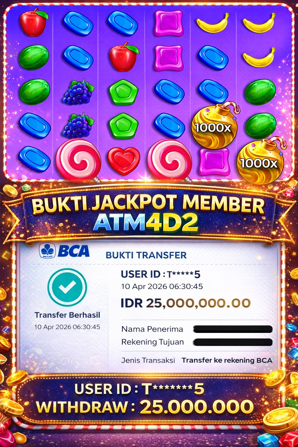 ATM4D2 dikenal sebagai situs terpercaya yang selalu menghadirkan pengalaman bermain slot online yang aman, fair, dan berlisensi resmi. Di sini, kami tidak hanya sekadar memberikan janji, tapi bukti nyata berupa slip kemenangan yang dapat Anda lihat secara langsung.