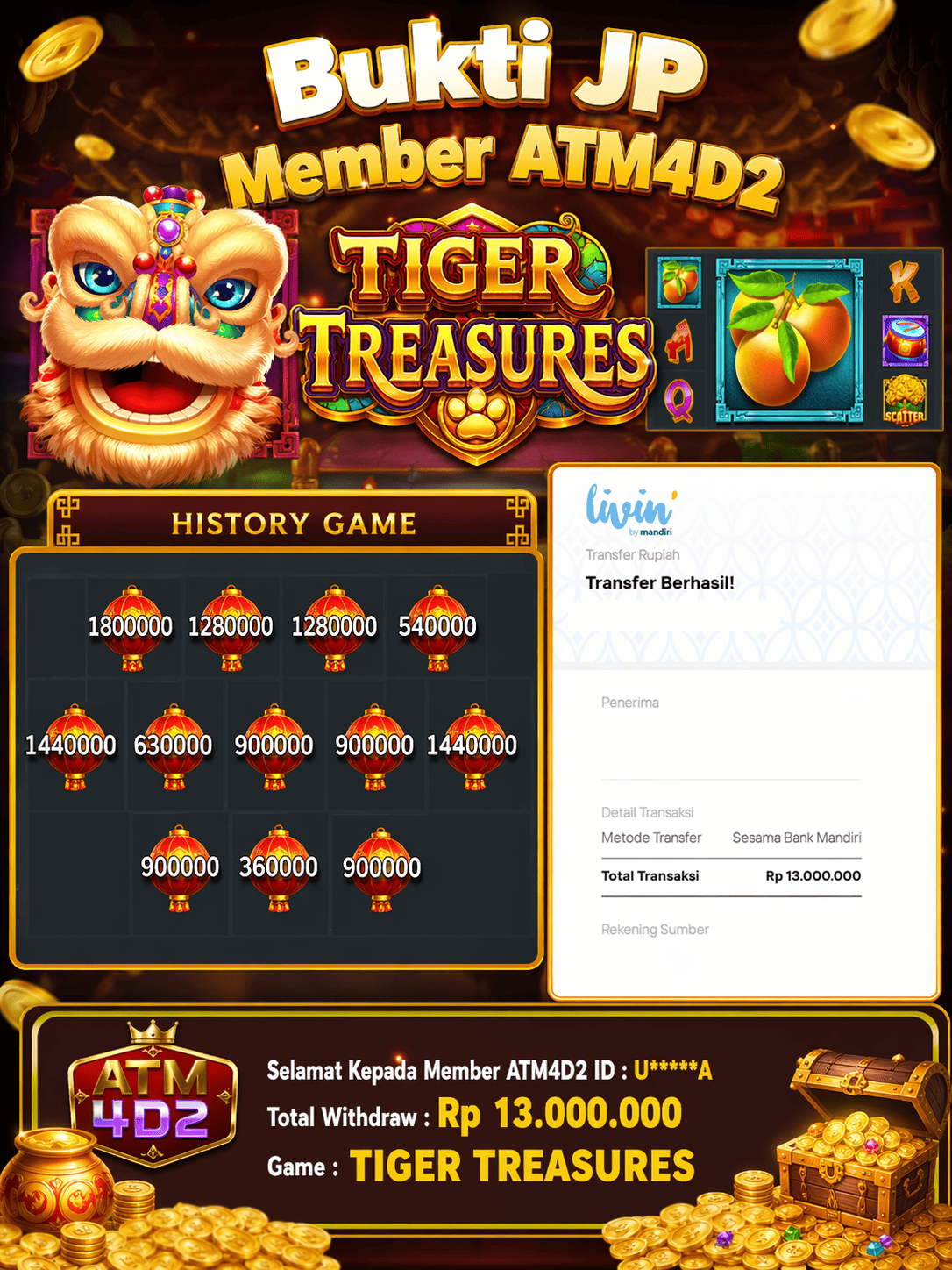 ATM4D2 dikenal sebagai situs terpercaya yang selalu menghadirkan pengalaman bermain slot online yang aman, fair, dan berlisensi resmi. Di sini, kami tidak hanya sekadar memberikan janji, tapi bukti nyata berupa slip kemenangan yang dapat Anda lihat secara langsung.