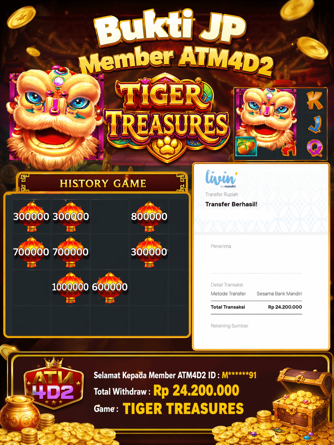 ATM4D2 dikenal sebagai situs terpercaya yang selalu menghadirkan pengalaman bermain slot online yang aman, fair, dan berlisensi resmi. Di sini, kami tidak hanya sekadar memberikan janji, tapi bukti nyata berupa slip kemenangan yang dapat Anda lihat secara langsung.