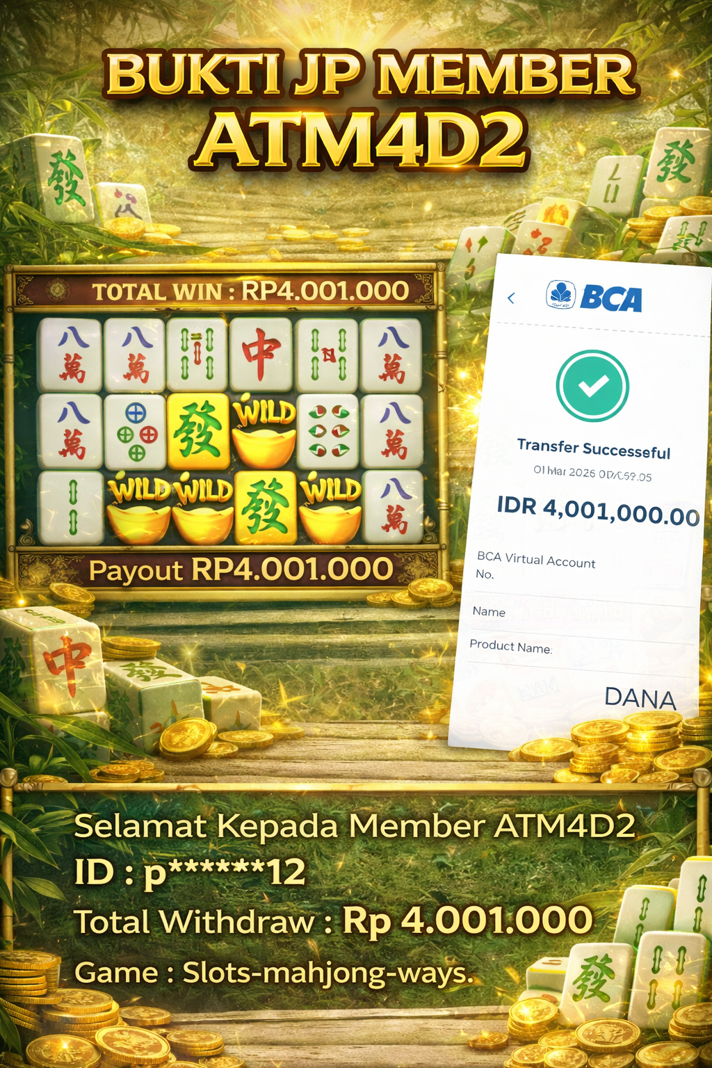 ATM4D2 dikenal sebagai situs terpercaya yang selalu menghadirkan pengalaman bermain slot online yang aman, fair, dan berlisensi resmi. Di sini, kami tidak hanya sekadar memberikan janji, tapi bukti nyata berupa slip kemenangan yang dapat Anda lihat secara langsung.